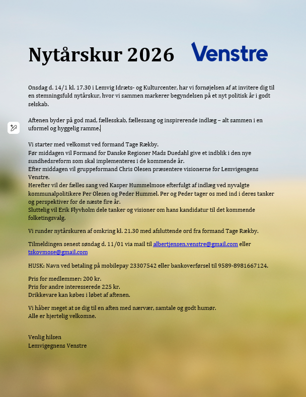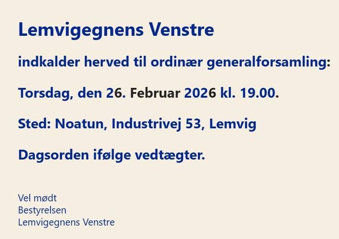 Menu ForsideBestyrelsenByrådsgruppenRegion midtjyllandRegionsbestyrelseEU-UdvalgetKredsbestyrelseFolketinget - lokaltValgresultaterVenstres UngdomVedtægterBank, CVR nr., kontakt, opdateringer m.v.